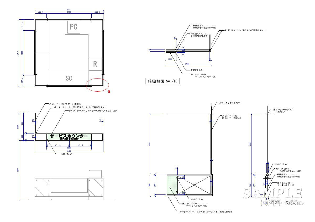 取り付けに関しては、天井スラブとの接合部を明示(a部詳細図)、吊りボルトやプレートの納まり、そしてスチールパイプの固定位置まで図示しました。