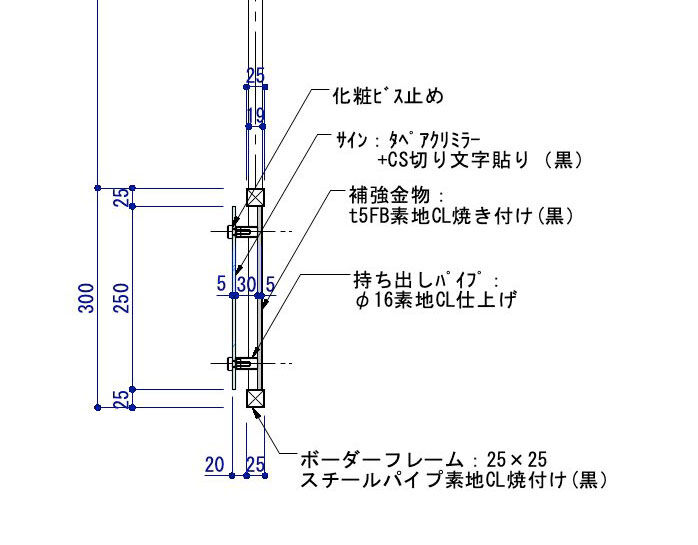 吊りサイン部は、25×25スチールパイプによるボーダーフレームで構成され、サインプレートを取り付けル仕組みになっています。サインは、タペアクリ+CS切り文字貼りで、視認を確保。