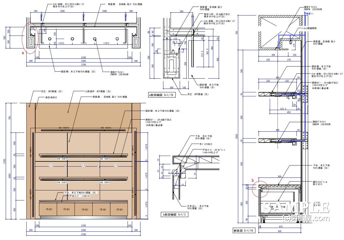 この作図事例は、レディースインナー売り場向けに設計したシステム什器の姿図・各部断面図です。