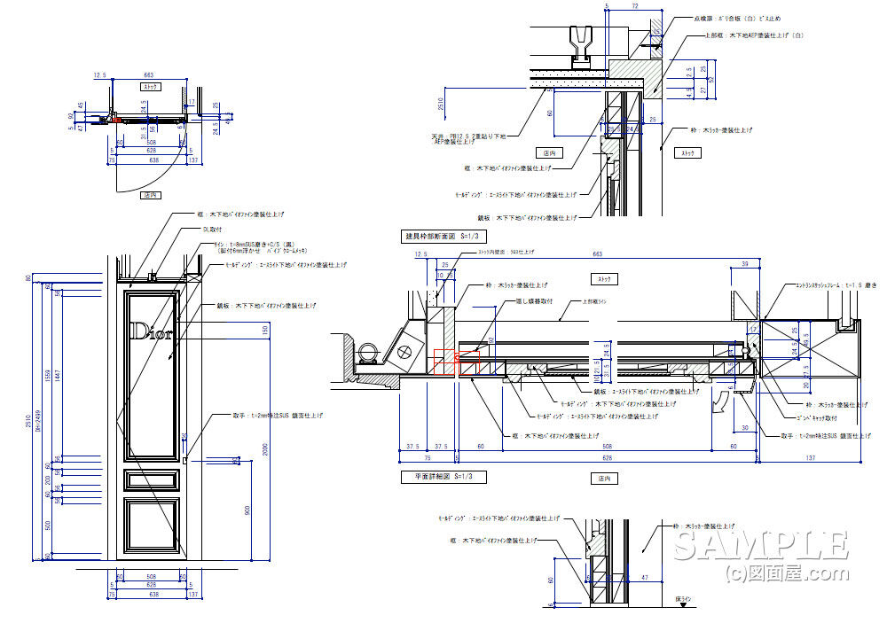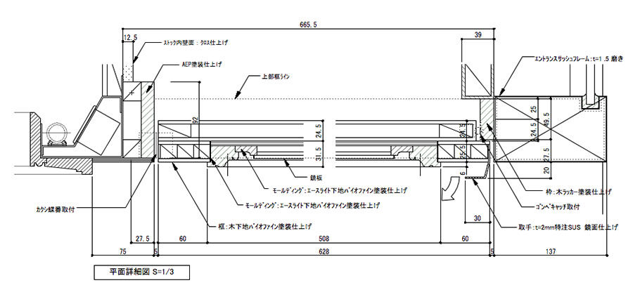 建具枠も見えない状態ですから、上品な高級感あるスーパーブランドでの空間には、まさにぴったしの建具です。京都伊勢丹オープン時で、マニュアルから引き出した建具図です。