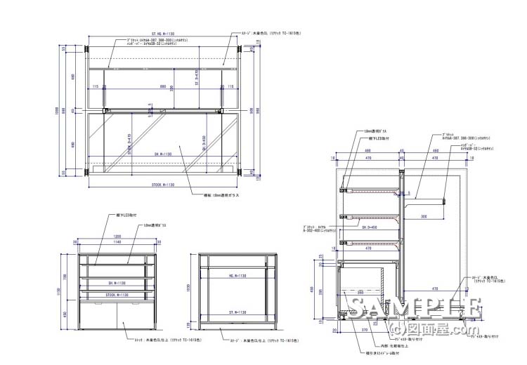 この作図事例はメンズショップのシステム什器の姿図と断面図です。