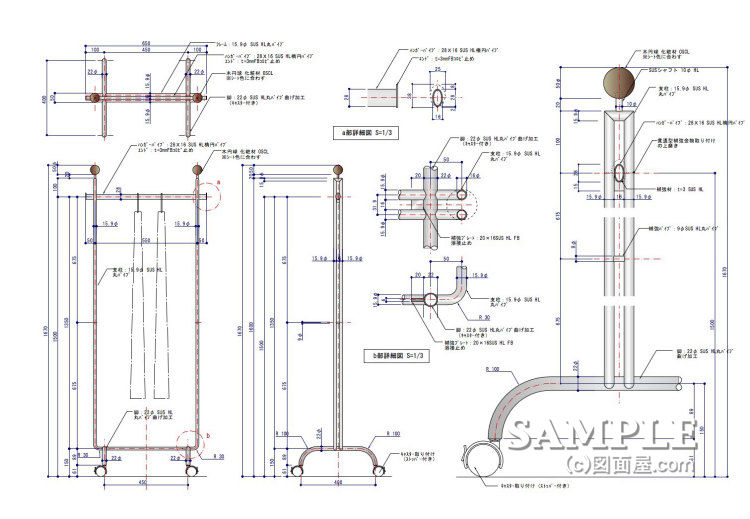 この作図事例はシングルハンガーラックの姿図と断面図です。