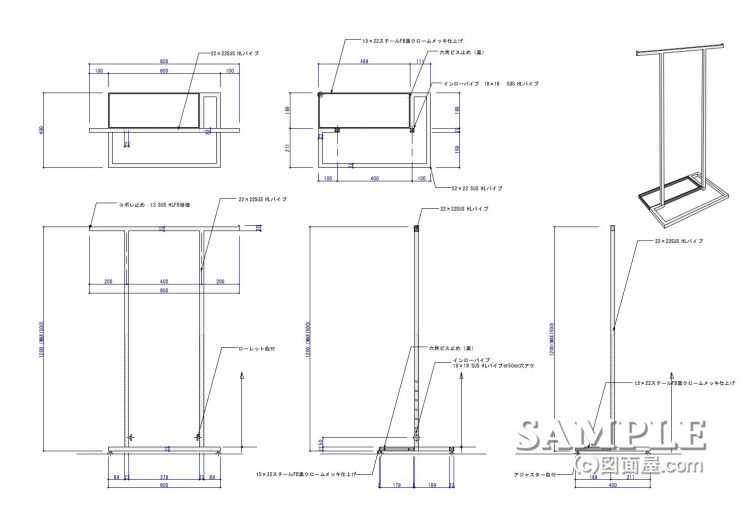 | W800×D400×H1200~1500 図面参照 | 本体:SUS HL角パイプ ベース:SUS HL+スチールFB黒クロームメッキ角パイプ | |