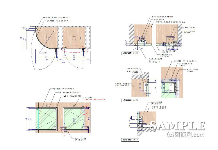 この作図事例は埋め込み型ショーケースBOXの姿図と各部詳細図です。