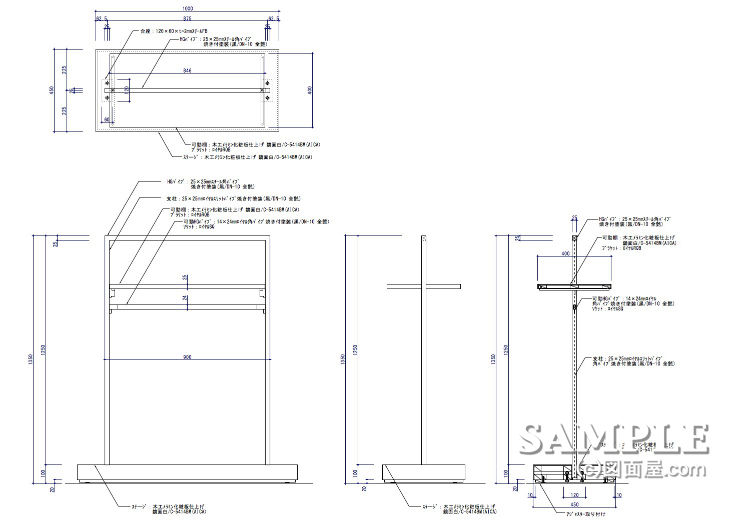 この作図事例は多機能なシングルハンガーラックの姿図と断面図です。
