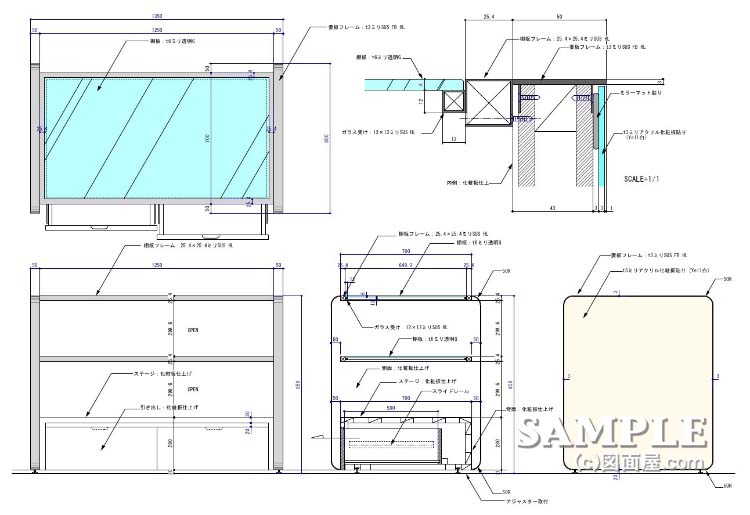 | W1350×D800×H950 図面参照 | 側板:木工アクリル化粧板仕上げ 側板フレーム:t=3 SUS HL 曲げ加工 棚板フレーム:25.4×25.4SUS HL角パイプ ステージ:木工化粧板仕上げ | |