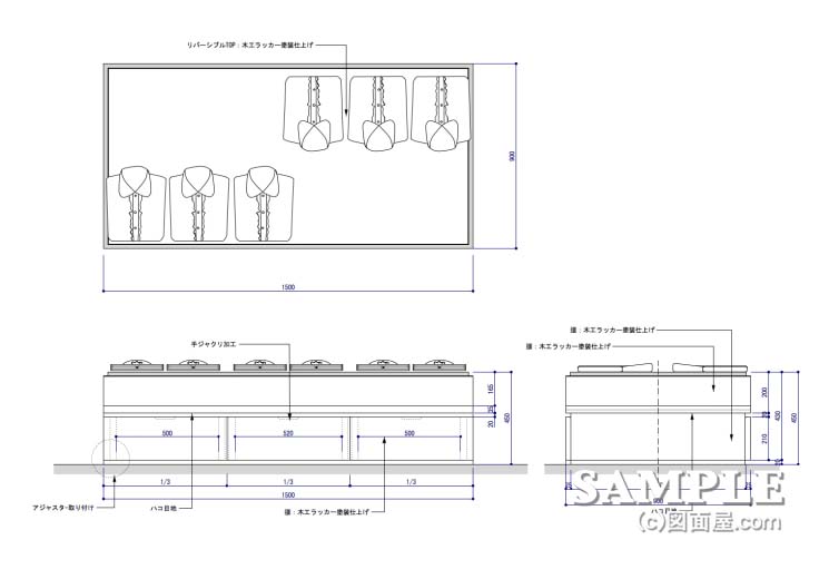 | W1500×D900×H450 図面参照 | テーブル天板:木ラッカー塗装仕上げ 天板裏面:ビニールレザー貼り 側面:木ラッカー塗装仕上げ | |