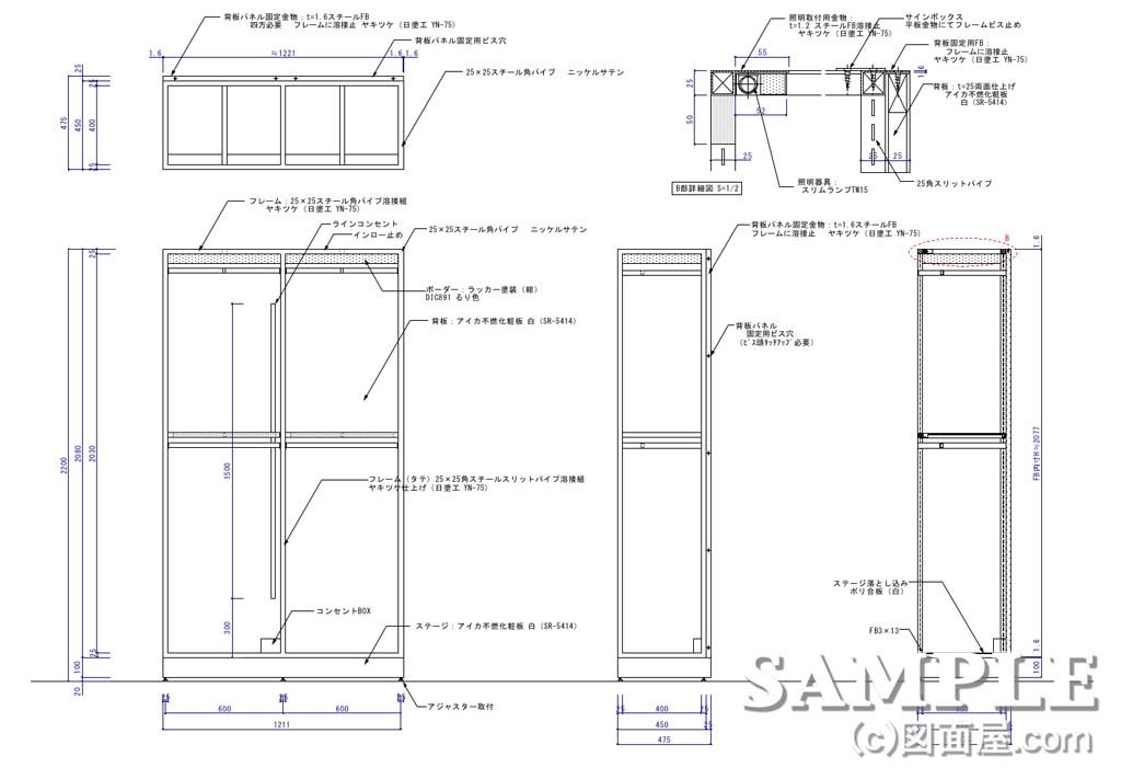 | W1825×D475×H2200 図面参照 | フレーム:25×25mmスチール角パイプニッケルサテン仕上げ 背パネル・ステージ:不燃化粧板仕上げ | |