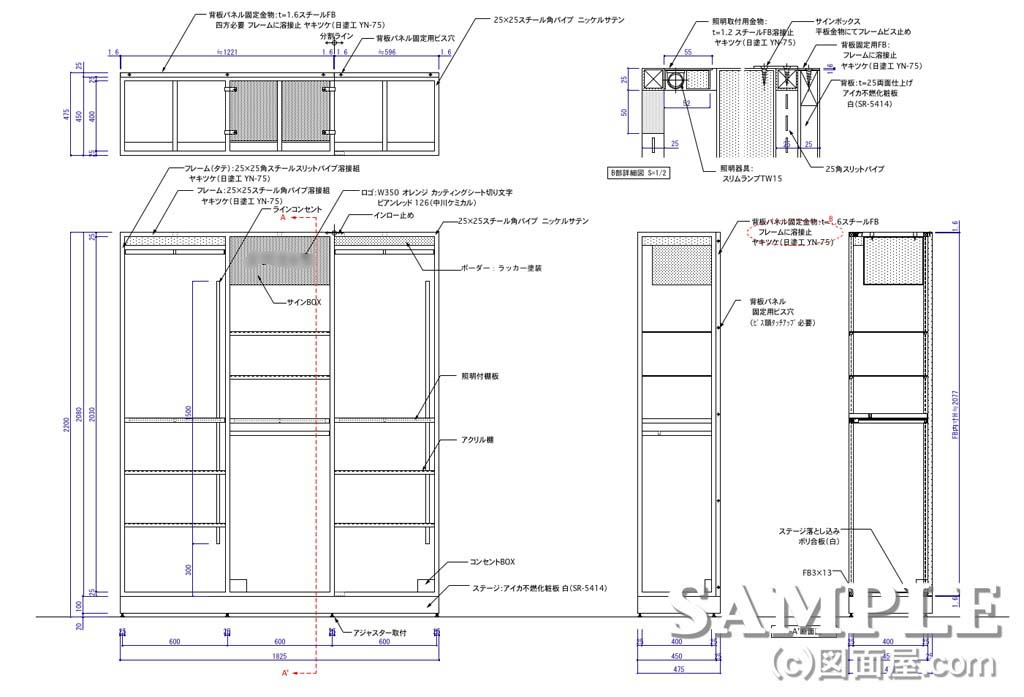 | W1825×D475×H2200 図面参照 | フレーム:25×25mmスチール角パイプニッケルサテン仕上げ 背パネル・ステージ:不燃化粧板仕上げ | |
