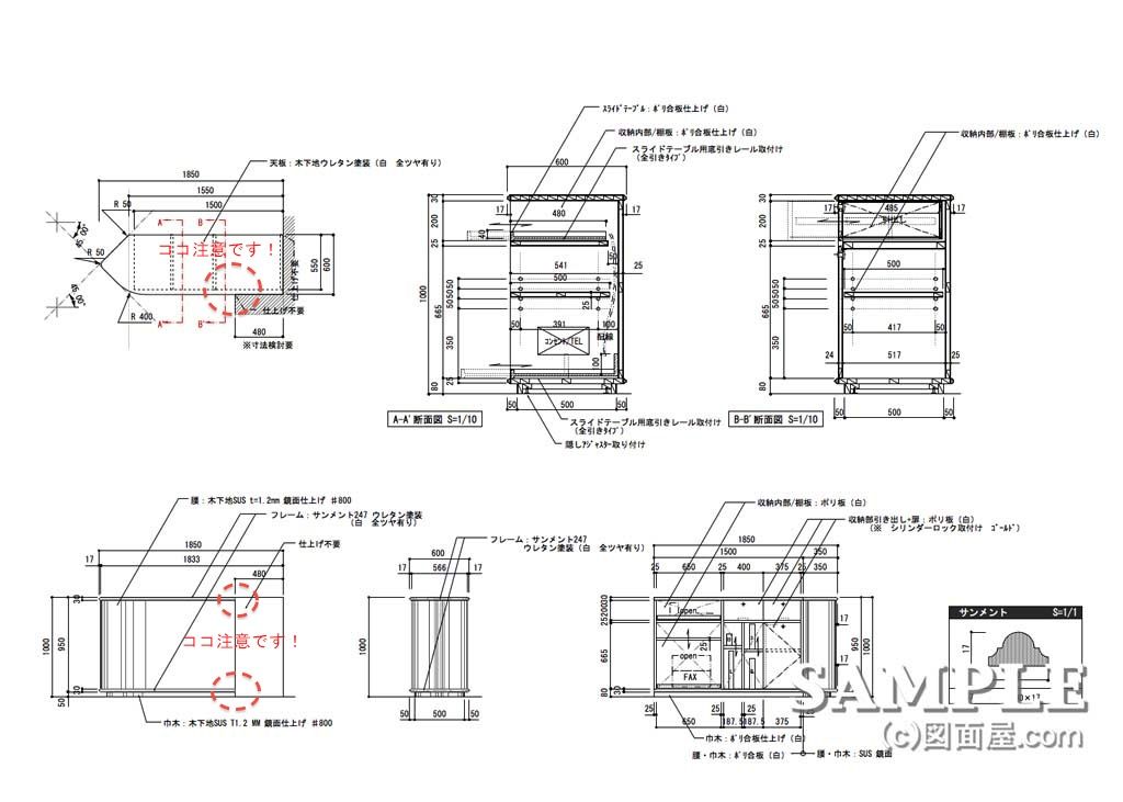 この作図事例は面材付サービスカウンターの姿図と断面図です。