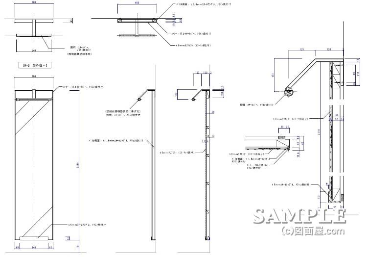 | W600×D250×H2300 図面参照 | ミラーパネル:木工下地t=6クリアミラー貼り 小口:t=1.6スチールチャンネル焼き付け仕上げ コーナーエッジ:φ10スチール丸棒焼き付け仕上げ ブラケット照明:50×15スチール曲げ加工+エースライン | |