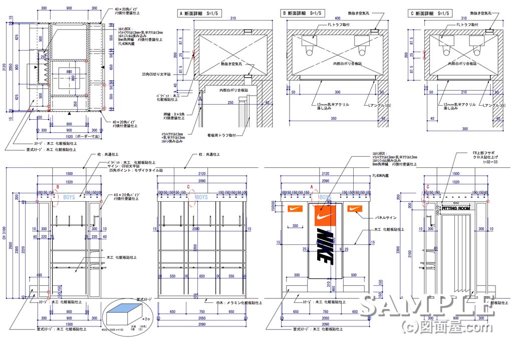 この図面は、百貨店や量販店などでのボリュームゾーンに当たる売り場の柱巻造作事例ですが、この場合は必ずといっていいほどフィッティングルーム(FR)が、存在します。