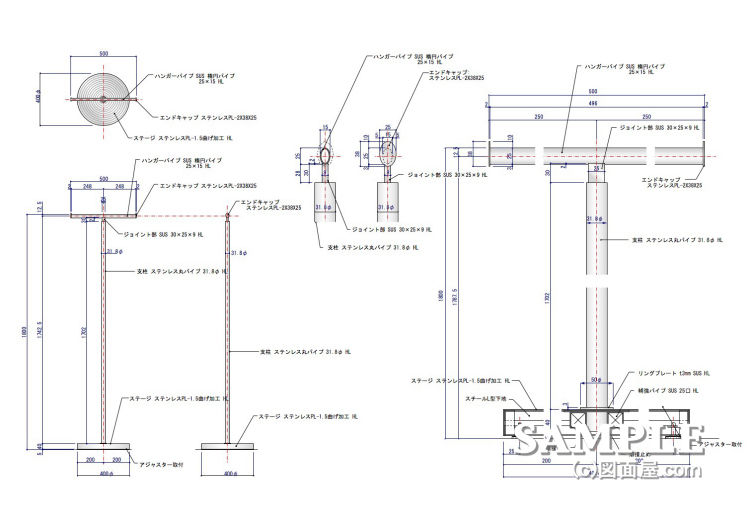 | W500×D400×H1600 図面参照 | ベース:SUS PL曲げ加工 HL仕上げ 支柱・HGパイプ:SUS HL丸パイプ | |