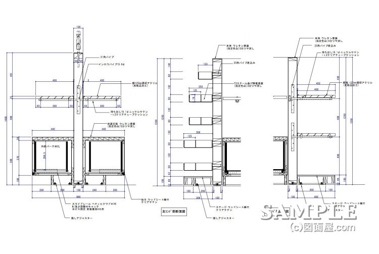 | W2207×D980×H1350 図面参照 | 本体・ストック:木工ウレタン塗装仕上げ 巾木:木工ウッドシート練り付け+クリアサテン仕上げ エンド側棚:t=3スチール曲げ加工静電塗装仕上げ | |