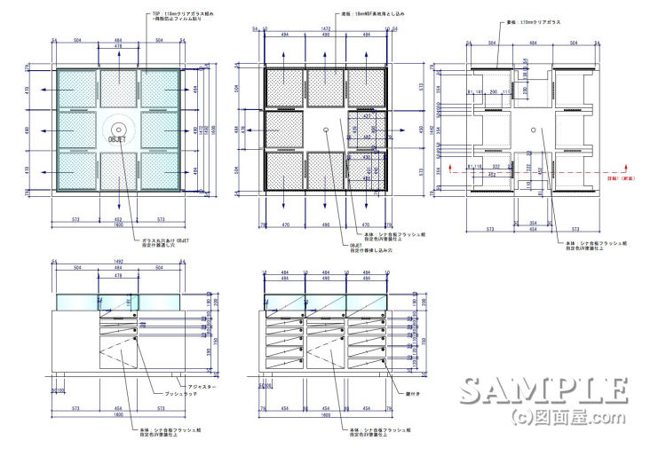 この作図事例はアクセサリーショーケースの姿図と断面図です。