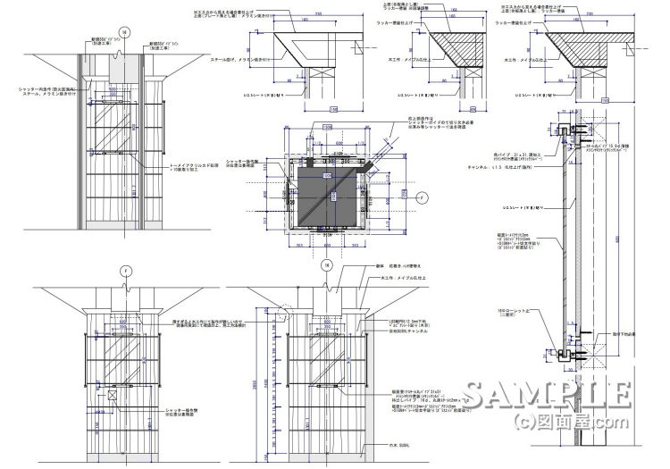 この作図事例は百貨店の食品売場にある柱造作の姿図と断面図です。