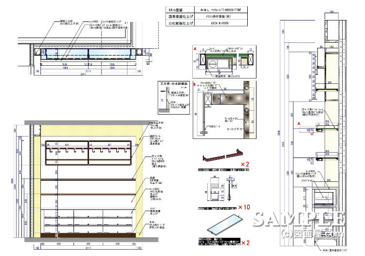 この作図事例は壁面造作の姿図と各部詳細図です。