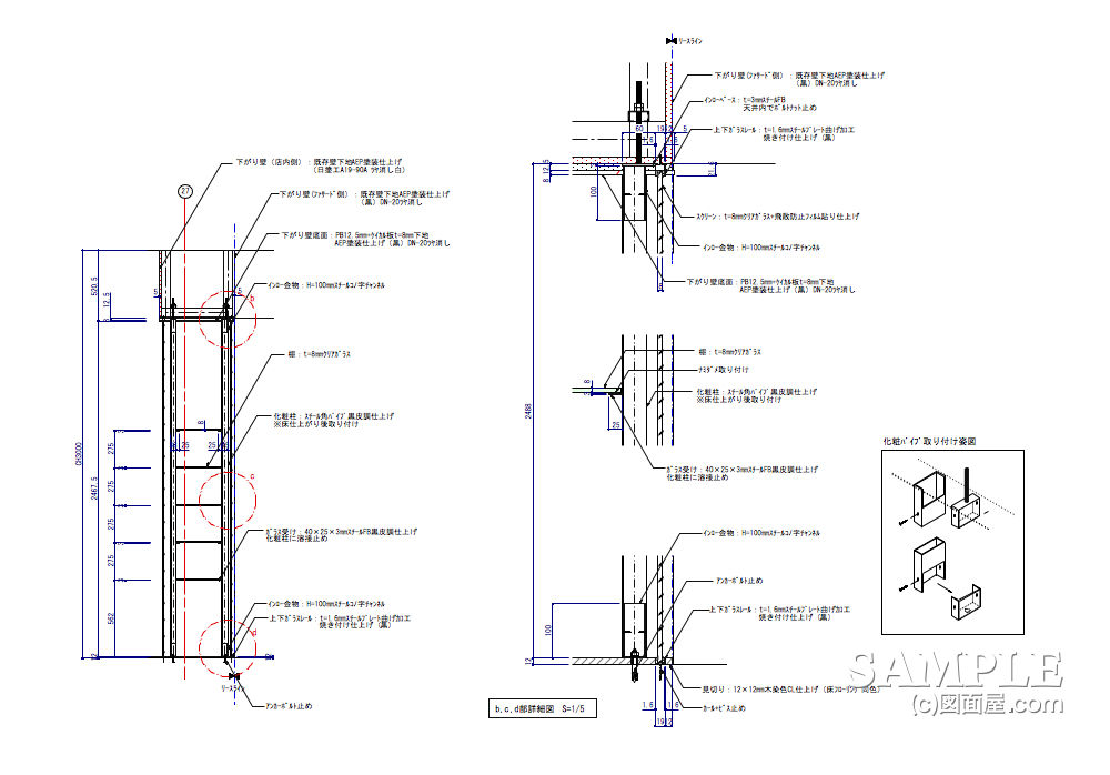 金物化粧柱を差し込むというか、この場合左から右にスライドさせてビスで固定します。このショーウインドでは、化粧柱が多いためにこの納めが一番と考えたわけです。ただ、問題もあります。