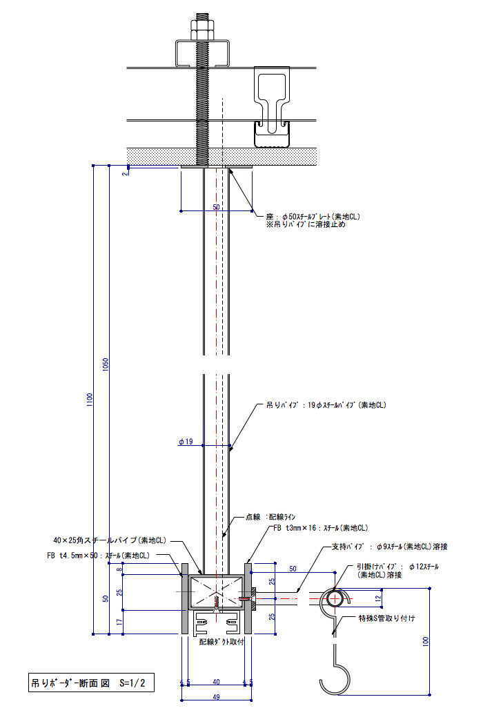 上記の図面は、吊りボーダー用のパイプとそれに付随するメッセージパネル(黒板)、配線ダクト等々です。