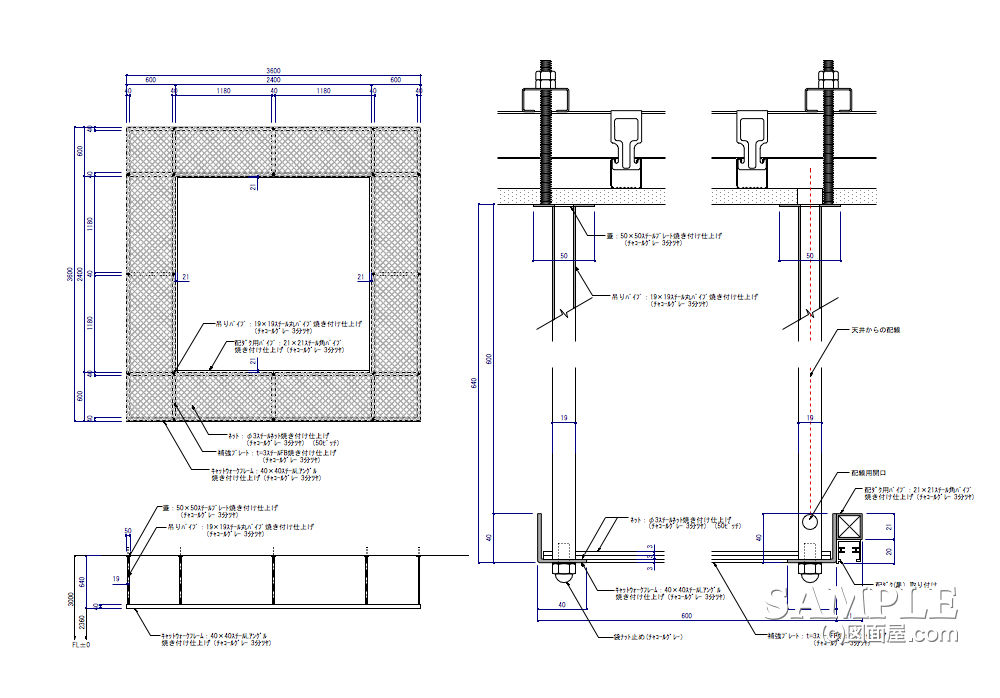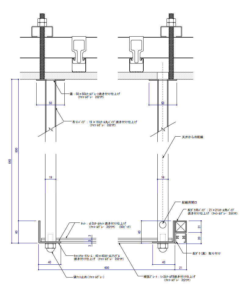 キャットウォークを模した吊り天井の詳細図ですが、あえて