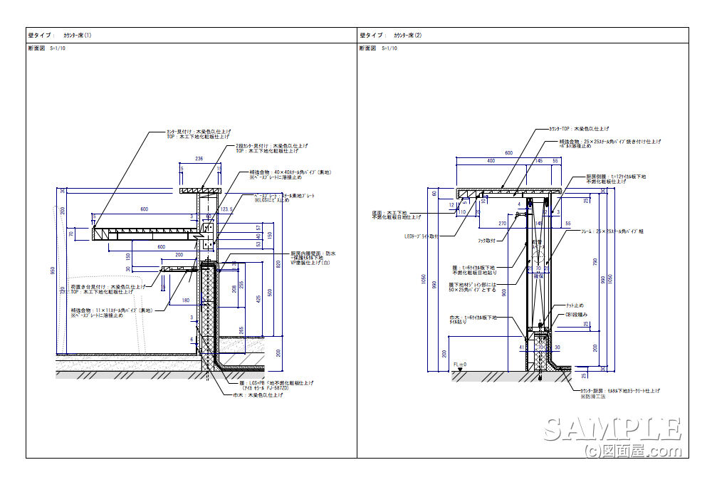 カウンターのイメージですが、本日はこのカウンターと立ち飲み専門のカウンターの断面詳細図について、お話しします。
