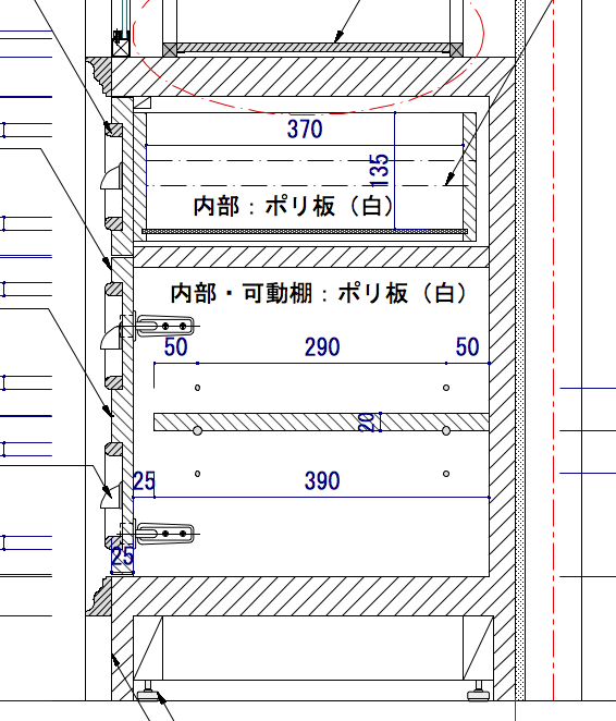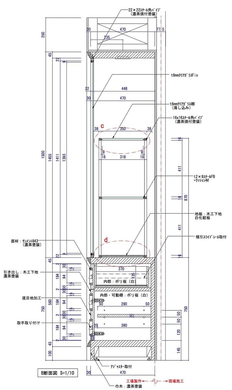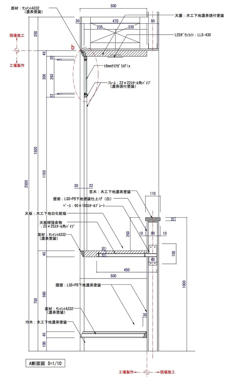 この場合、工場で製作するものと現場施工の分割ラインや指示をしておきます。