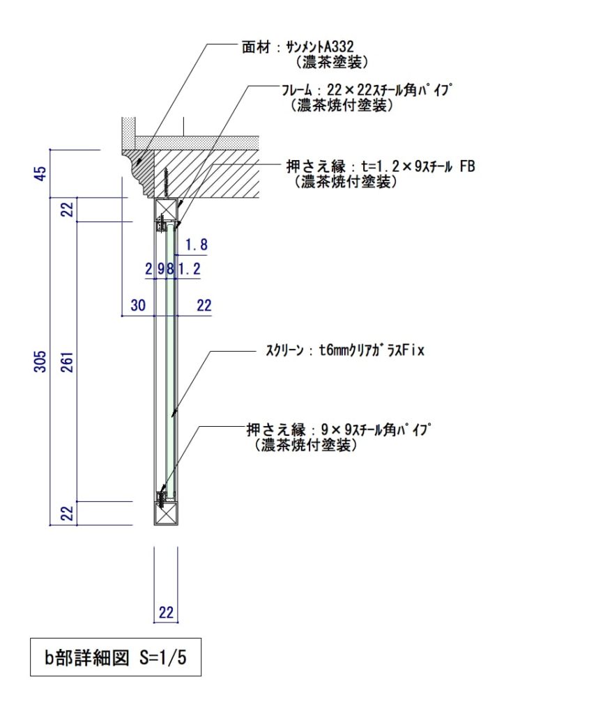 上部欄間のガラススクリーンは前述で記しているように角パイプフレーム+ガラスの構成です。