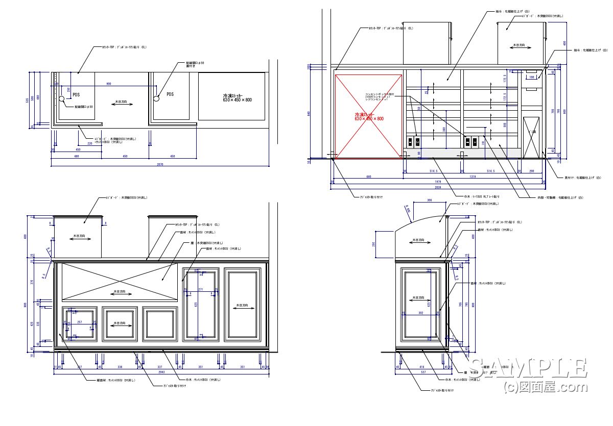今回の事例は、ケーキショップのレジカウンター図を例にとって、サンメント(面材)の納まりついて検証していきます。