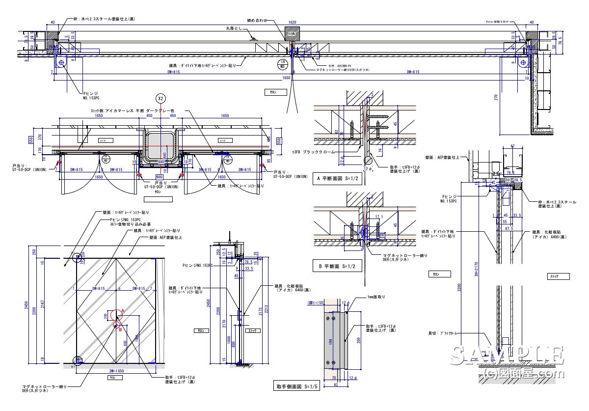 A・Bの断面詳細図では、ヒンジの取り付きや仕上げの取り合いまで細かく描かれており、施工精度の高さが求められる設計です。