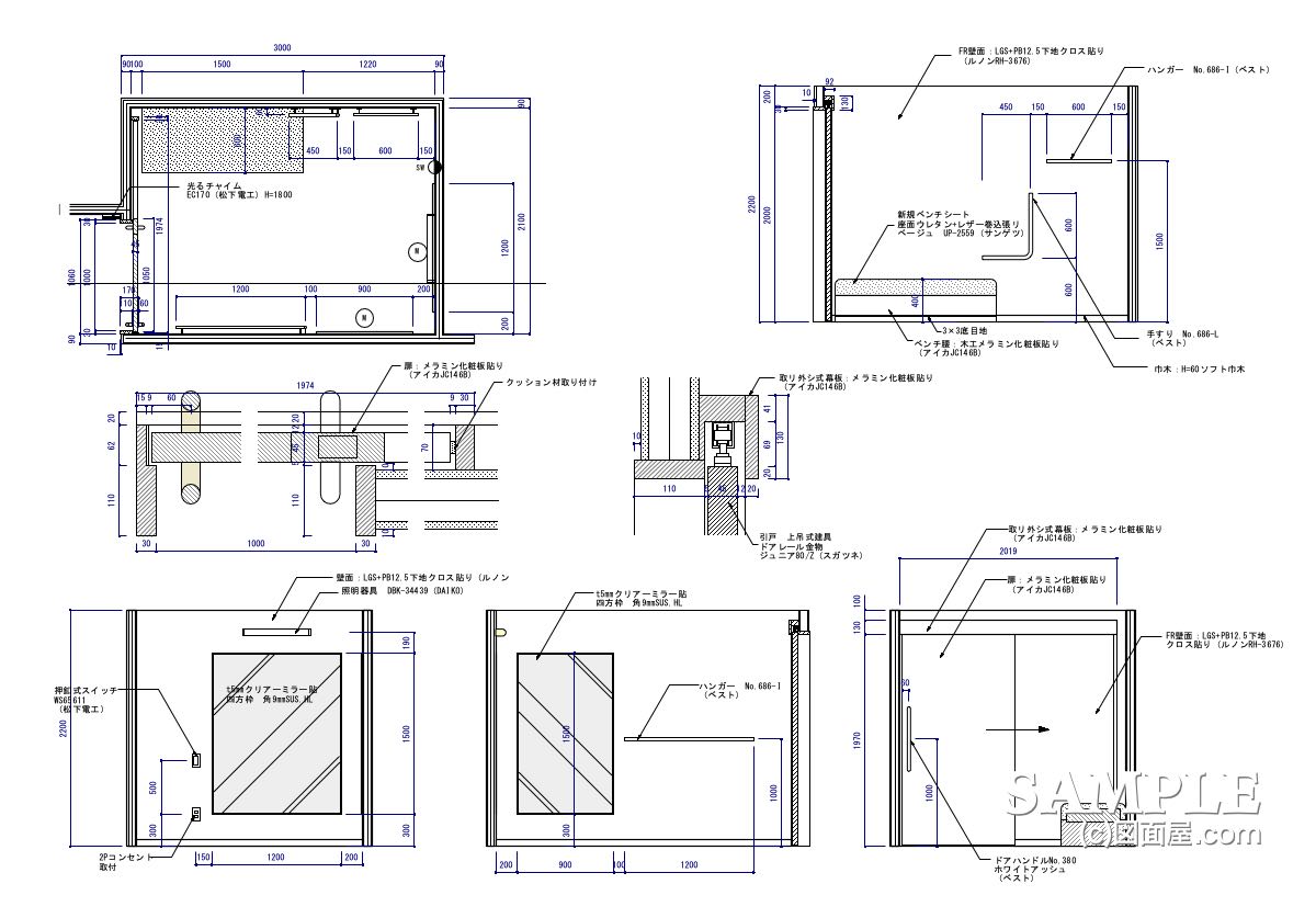 W3000×D2100×H2200 図面参照 | 壁面:LGS+PB下地クロス仕上げ 引き戸:木工化粧板仕上げ