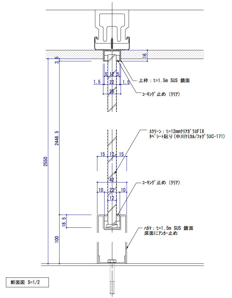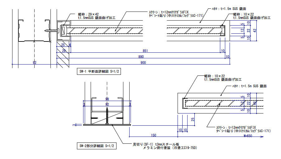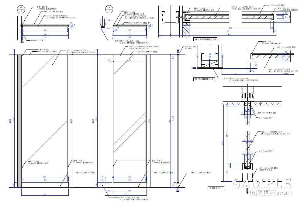 この作図事例は、ガラススクリーン(パーティション)の姿図と断面図及び各詳細図です。