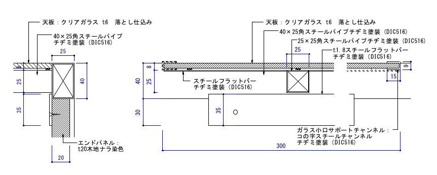 もう一つの課題は、左右のエンドパネルの固定方法です。部分詳細図ではフラットバーがフレームと接する面が少なく、什器の移動やディスプレイ替えなどの小さな衝撃でも弱点になりやすい構造です。