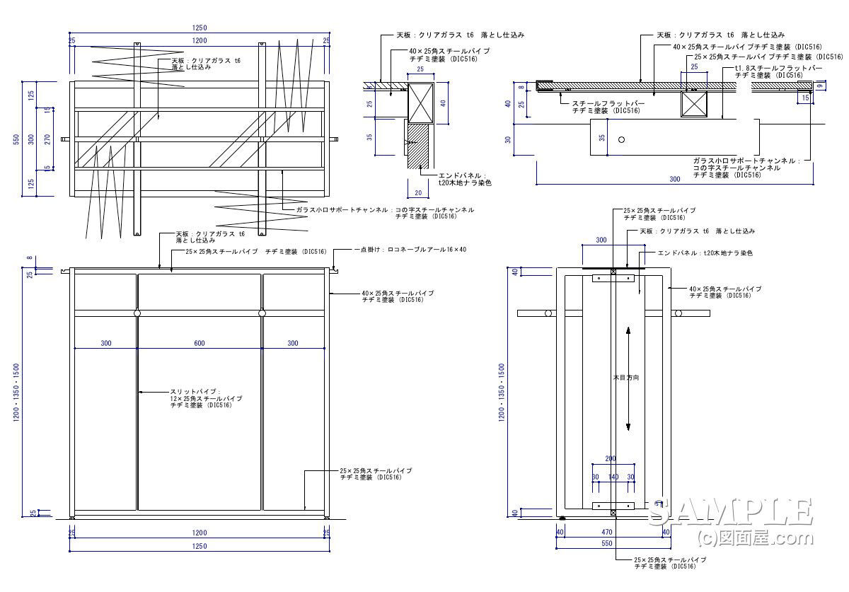 | W1250×D550×1250〜1500 | 木部:ナラ材染色CL仕上げ 金物部:スチールチヂミ塗装 |