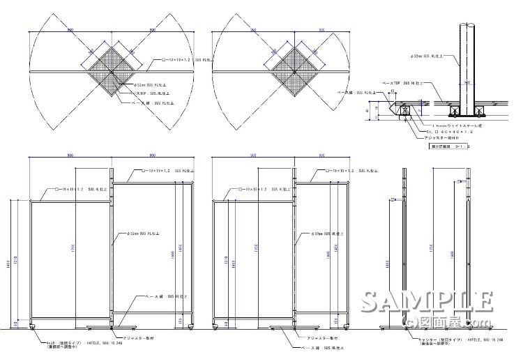 この作図事例では、パイプハンガーの長さを変えた2タイプの什器が、描かれていますが、断面図は全く同じです。ですから、作図上では、片方の断面図だけで充分通用します。