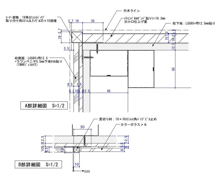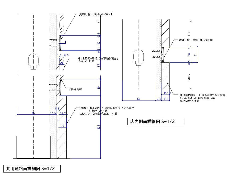 やけに細かい図面を見て頂いてますが、この作図事例はタイル貼り造作柱の図面なのです。