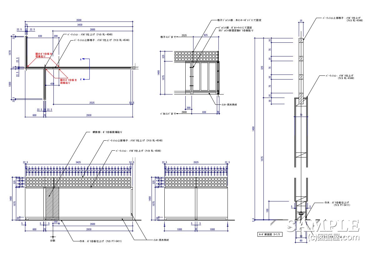 この作図事例は格子付きパーティションの姿図と断面図です。