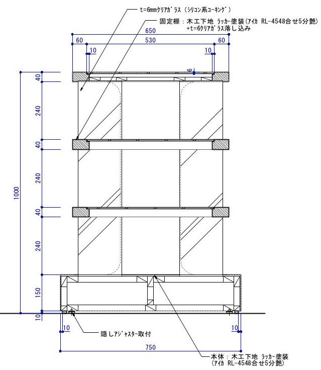 棚板自体は木工下地にラッカー塗装仕上げとなっており、見た目はシンプルだが、固定ビスの効きや、棚板の沈み込みを防ぐための補強方法など、目に見えない部分の処理が図面上の大事なポイントになる。