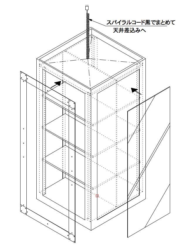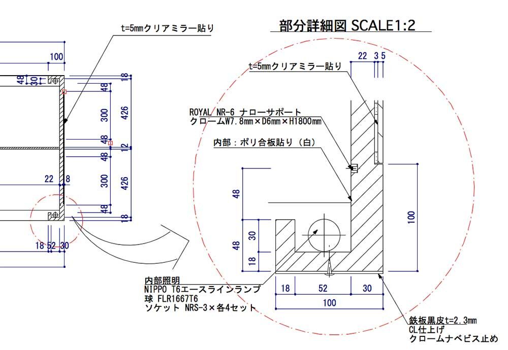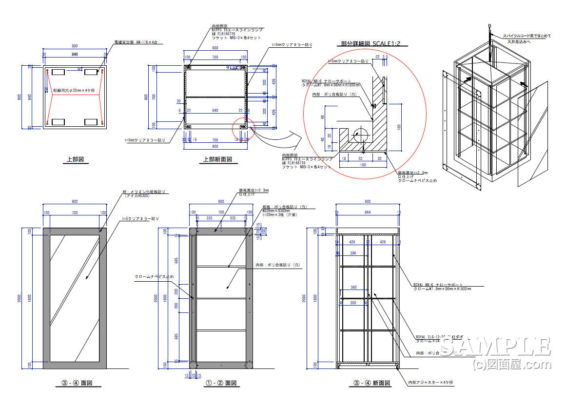 この作図事例は、ハイタワー型オープン式の棚什器の姿図とその断面図と詳細図です。