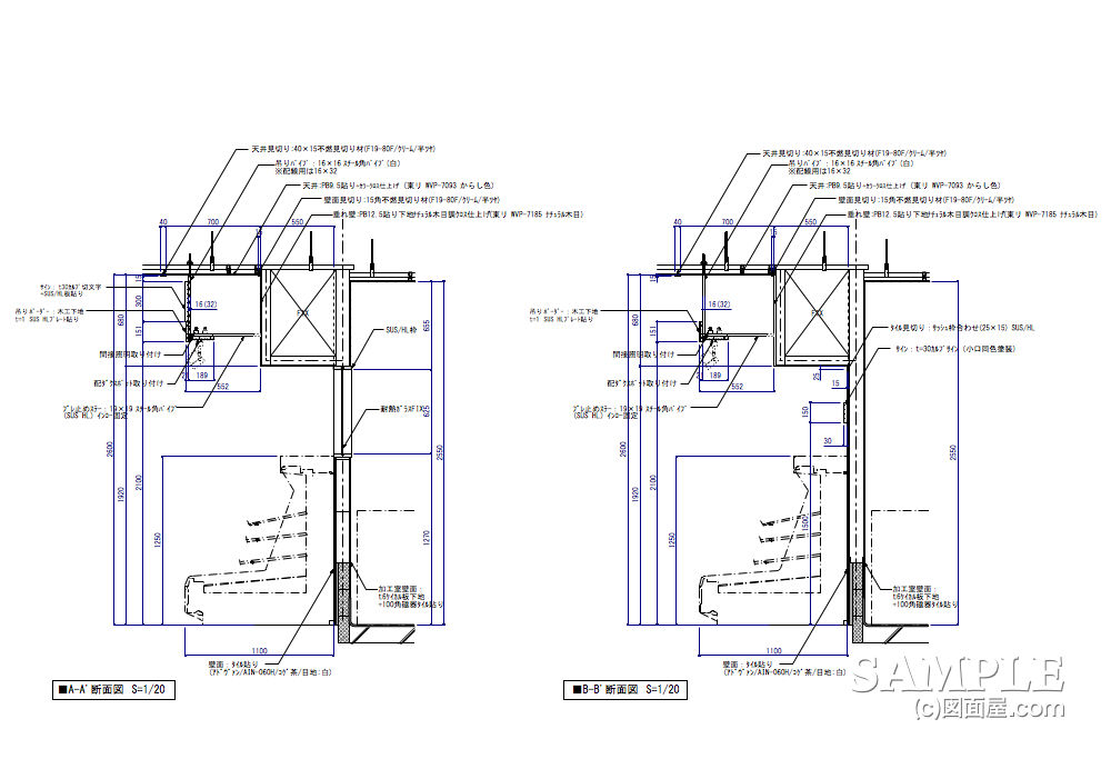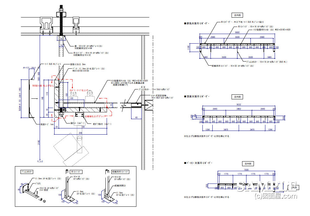 上記、図面事例は、食品スーパーの売場でよく目にする壁面ボーダーモ断面図です。このボーダーには、各食材の売場名が表記されています。精肉、鮮魚、デリ(デリカテッセン)などなどです。