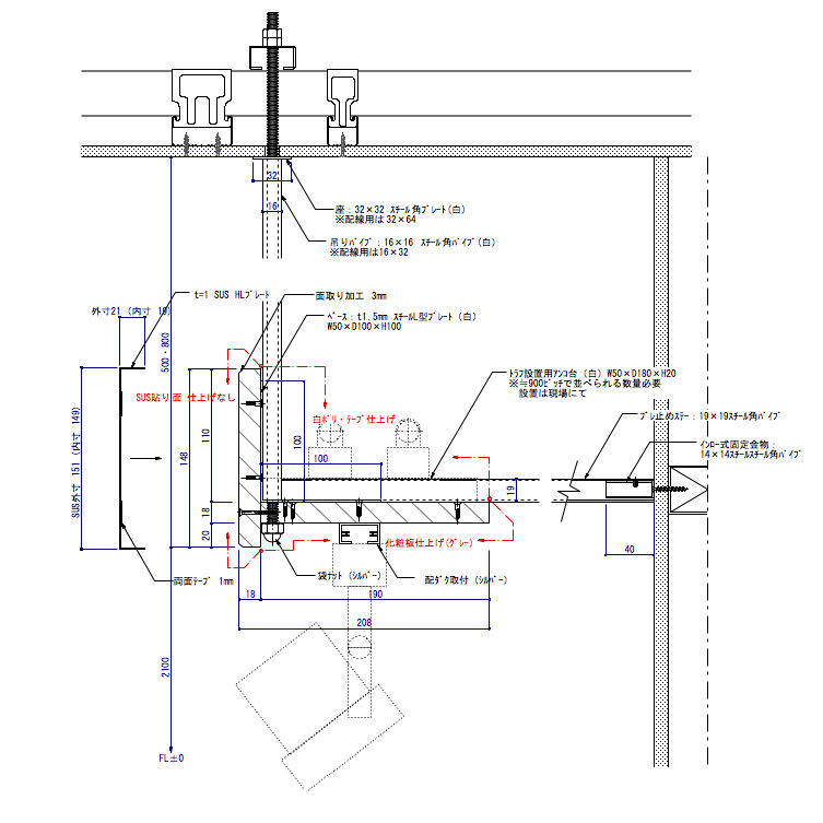 吊り物は、天井を貫通してチャンネルにナット締めとなります。そして壁面での振れ止め補強として、私がよく使う手は、