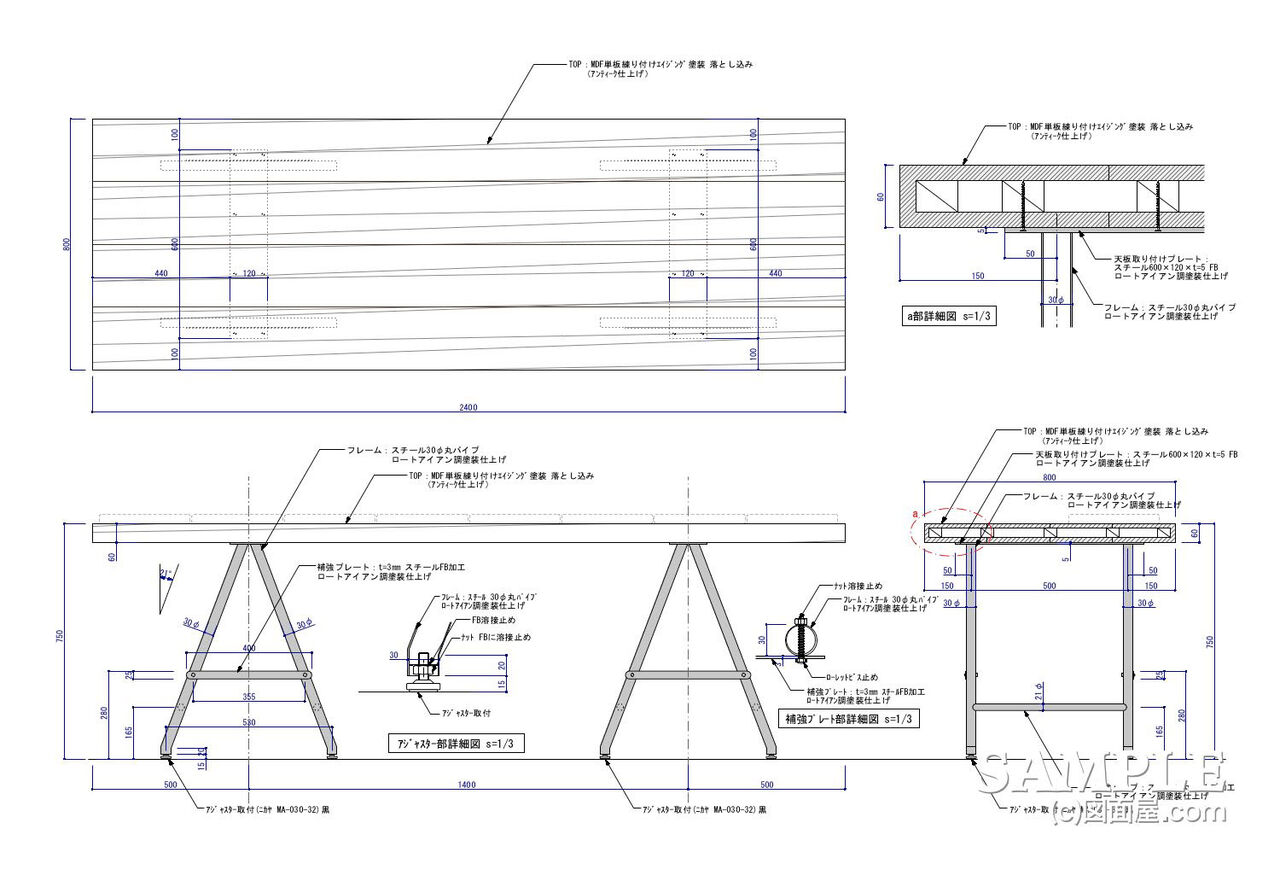 | W2400×D800×H750 図面参照 | 天板:MDF単板練り付けエイジング塗装 脚:スチール30φ丸パイプロートアイアン調塗装仕上げ | |