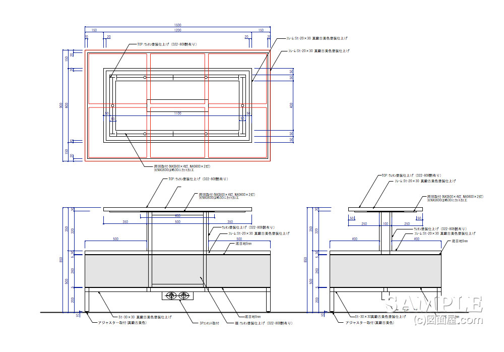 図面上では、赤い破線で表現されているところが、骨組みのラインとなっています。