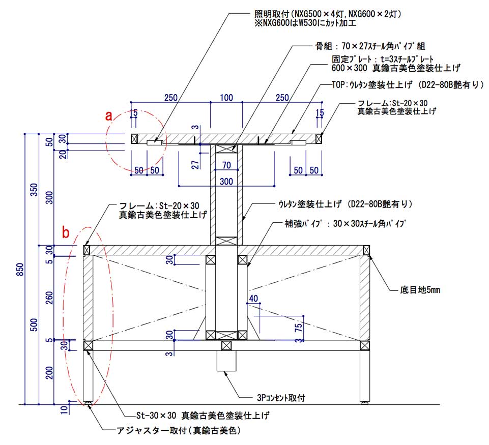 固定用スチールプレートは3mm厚+天板にビス止めとします。
