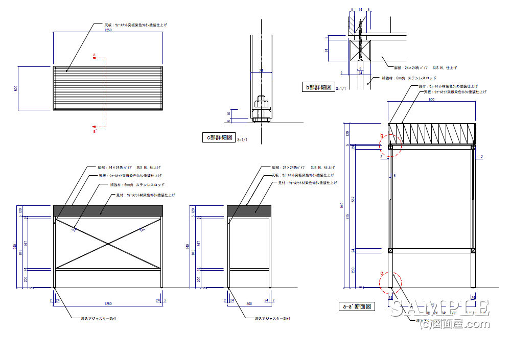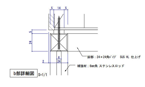 腰部には24×24スチール角パイプを組み、補強のためにそれぞれの角パイプにステンレスロッドφ6mmを溶接処理しました。 それでは、今回の作図事例で覚えておいて欲しい詳細図などがあります。 続きをご覧下さい。