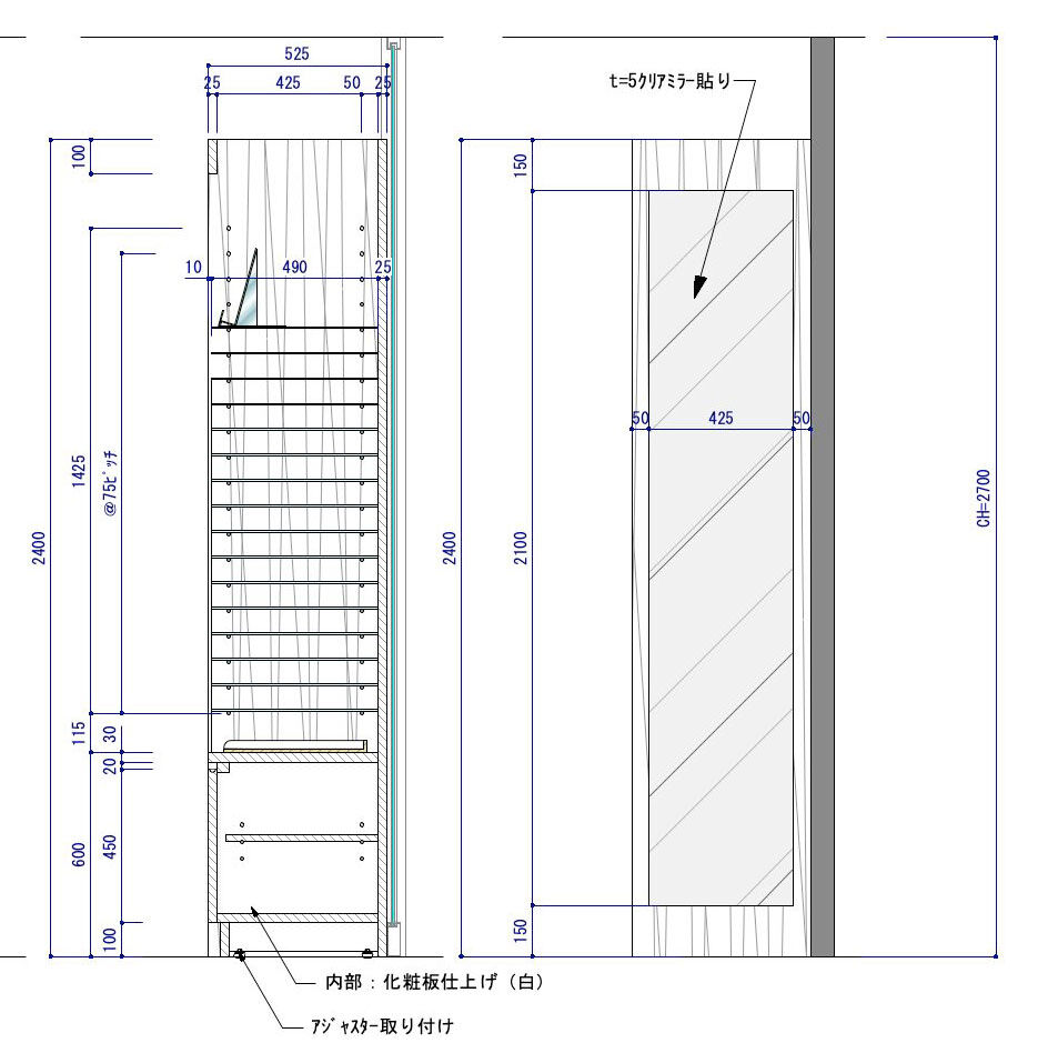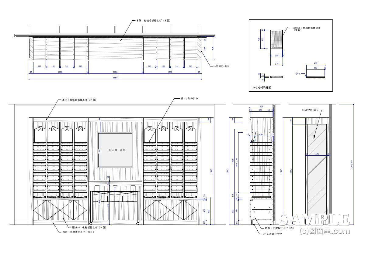 断面図では、BOXの奥行バランスやストック部の構成まで追えるようになっており、什器としての全体像が分かりやすい図面になっています。